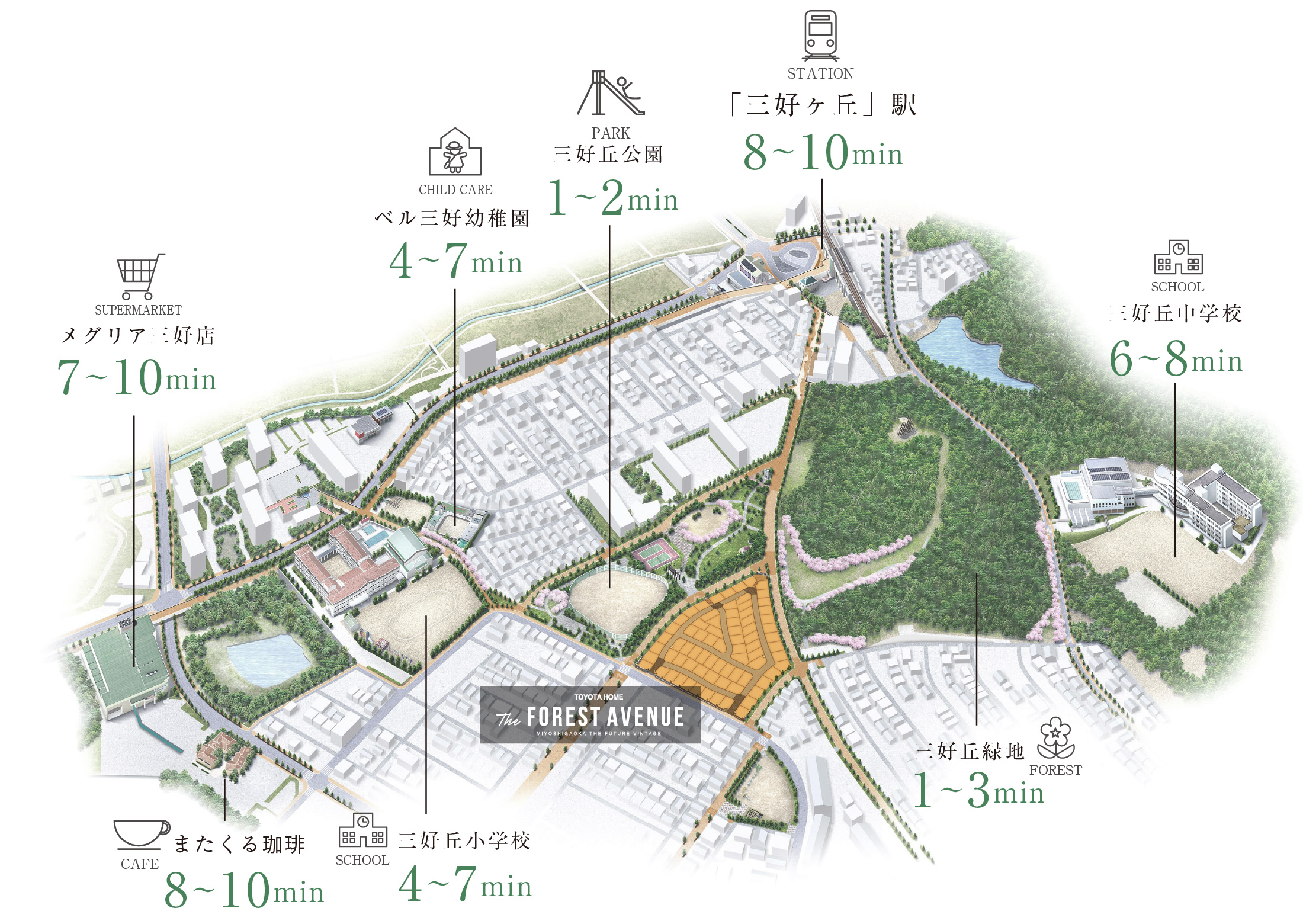 三好ケ丘は、街全体が約5kmの遊歩道で囲まれ、ごく一部の場所を除いて車の往来を気にせず、ウォーキングやジョギングを楽しむことができます。また小・中学校やスーパーなどの施設も徒歩圏内に充実した「歩いて快適に暮らせる」都心近接のベッドタウンです。